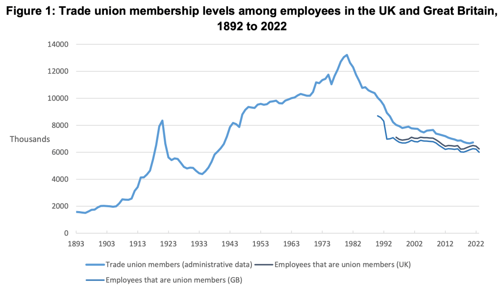 A graph detailing the rise and decline in trade union membership, which hit its peak in 1979